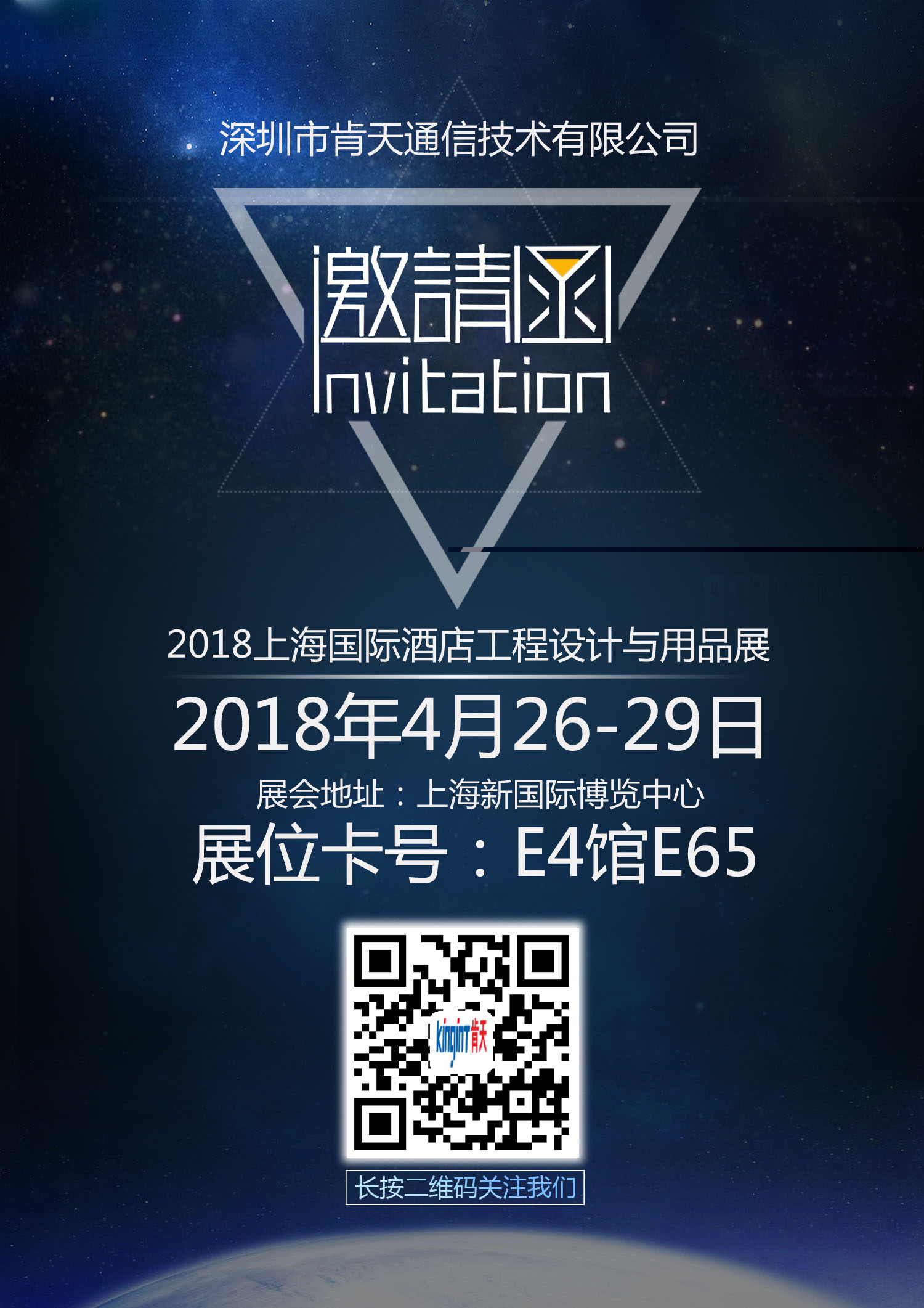 行业盛会,真诚相约!创智慧生活,智慧城市、智慧酒店、建筑节能服务商——Kingint肯天,诚邀您共聚,酒店餐饮行业的博览会之一——上海国际酒店用品博览会(二期)将于2018年4月26日-4月29日在上海新国际博览中心盛大开展。