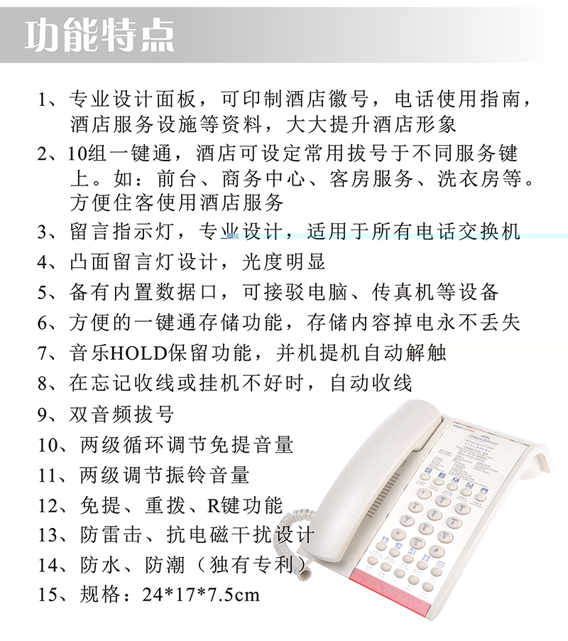 2、10组一键通(服务键),酒店可设定常用拔号于不同服务键上。如:前台、商务中心、客房服务、洗衣房等。方便住客使用酒店服务
