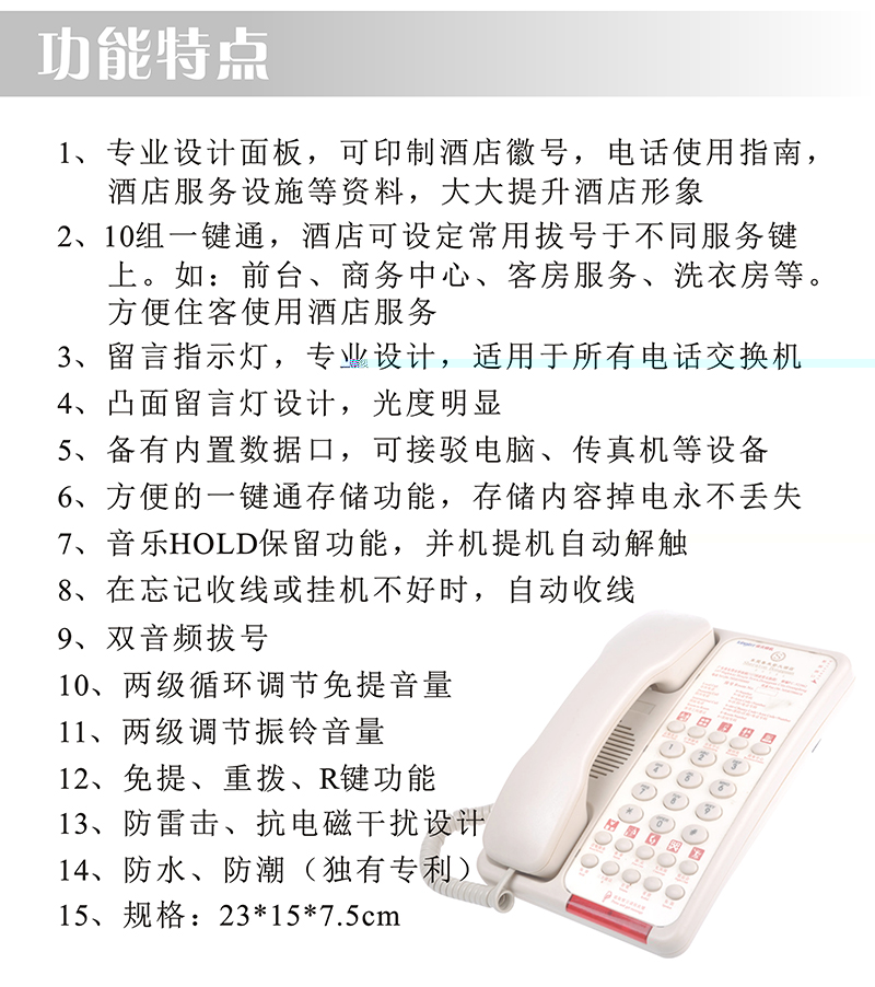 2、10组一键通(服务键),酒店可设定常用拔号于不同服务键上。如:前台、商务中心、客房服务、洗衣房等。方便住客使用酒店服务