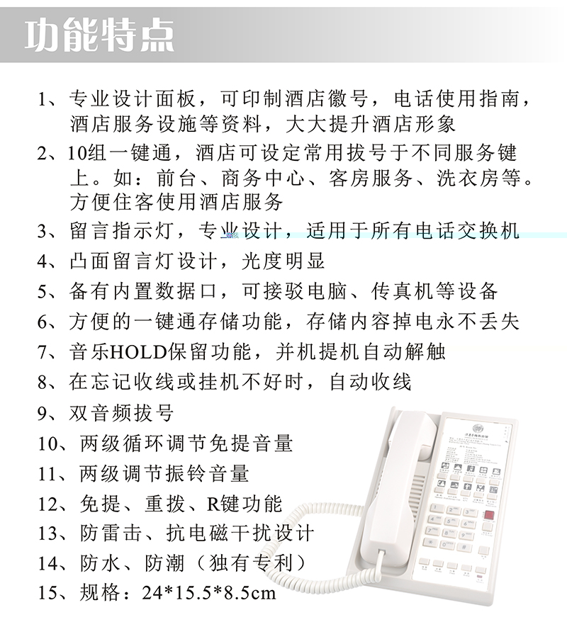 1、专业设计面板,可印制酒店徽号,电话使用指南,酒店服务设施等资料,大大提升酒店形象